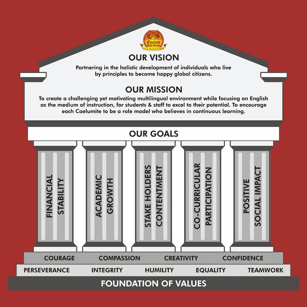 To create a challenging yet motivating multilingual environment while focusing on English as the medium of instruction, for students & staff to excel to their potential. To encourage each Caelumite to be a role model who believes in continuous learning.